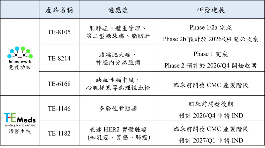 註2:TE-8105、TE-6168及TE-1146分別於2019、2026及2025年被財團法人醫藥品查驗中心 (CDE) 認證為新藥開發指標案件。
