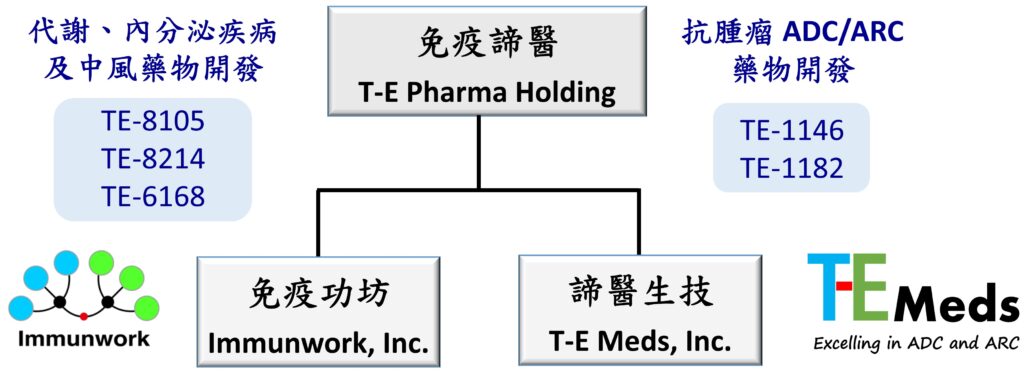為進一步提升研發效率並拓展產品線布局,免疫諦醫於2022年成立第二家子公司 — 諦醫生技股份有限公司,並依序完成兩輪共約新台幣8億元的增資,專注於推動ADC/ARC相關新藥開發。隨著企業體業務規模持續擴展,為強化整體營運效率與資本運作彈性,公司於2025年完成組織重整,將免疫諦醫 (T-E Pharma Holding) 作為控股與資本運作平台,百分百持有旗下免疫功坊與諦醫生技兩家子公司,建立分工明確且有利於國際資本市場發展的企業架構。