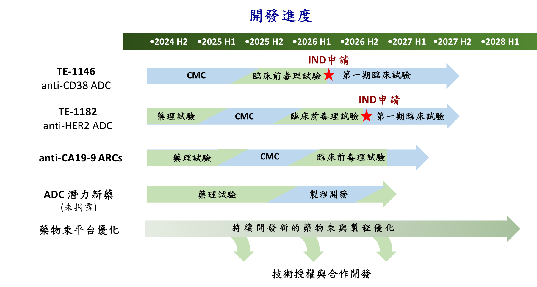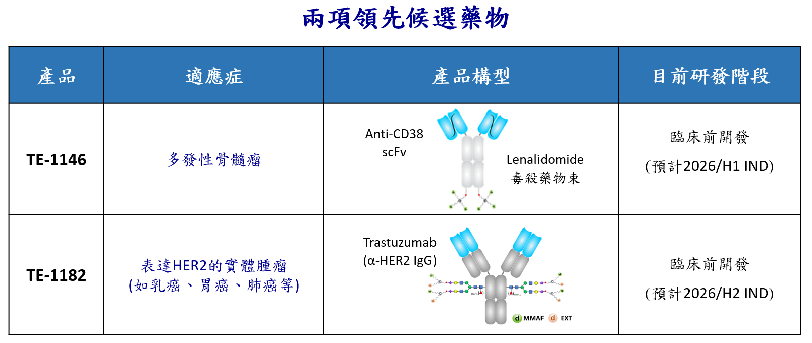 其中兩項領先的 ADC 候選藥物 — TE-1146 與 TE-1182,目前均處於臨床前開發階段,預計於 2026 年先後提交 IND 申請。